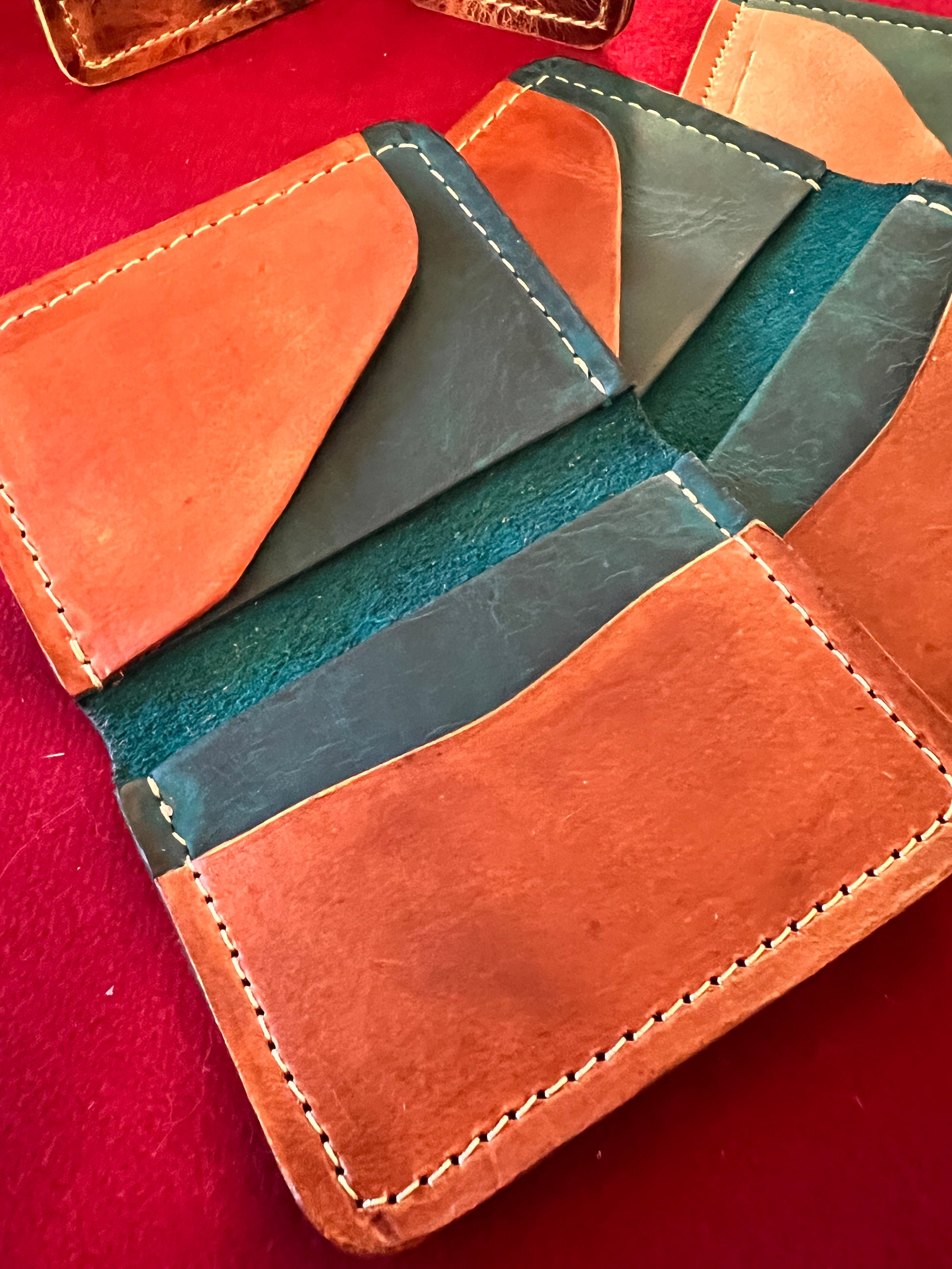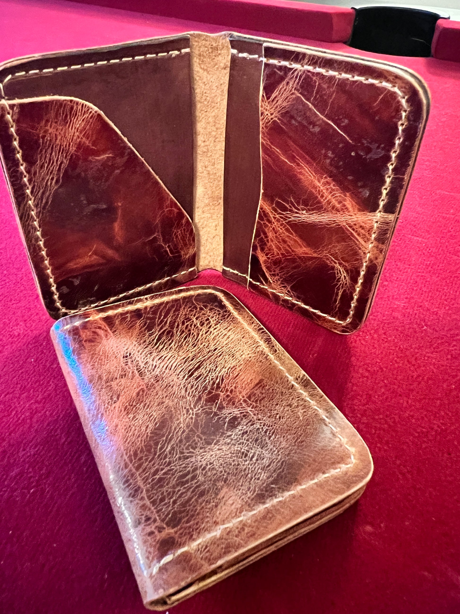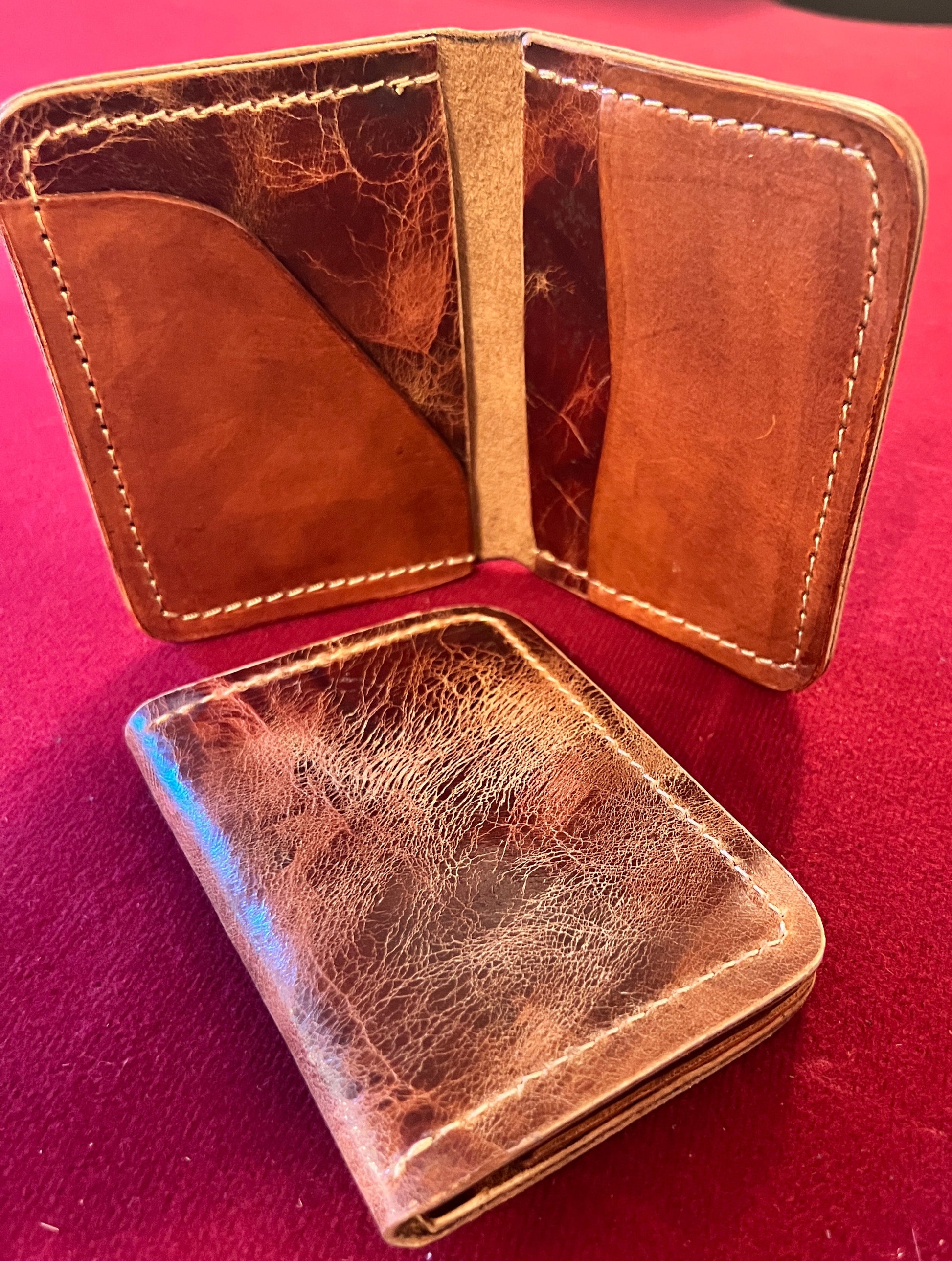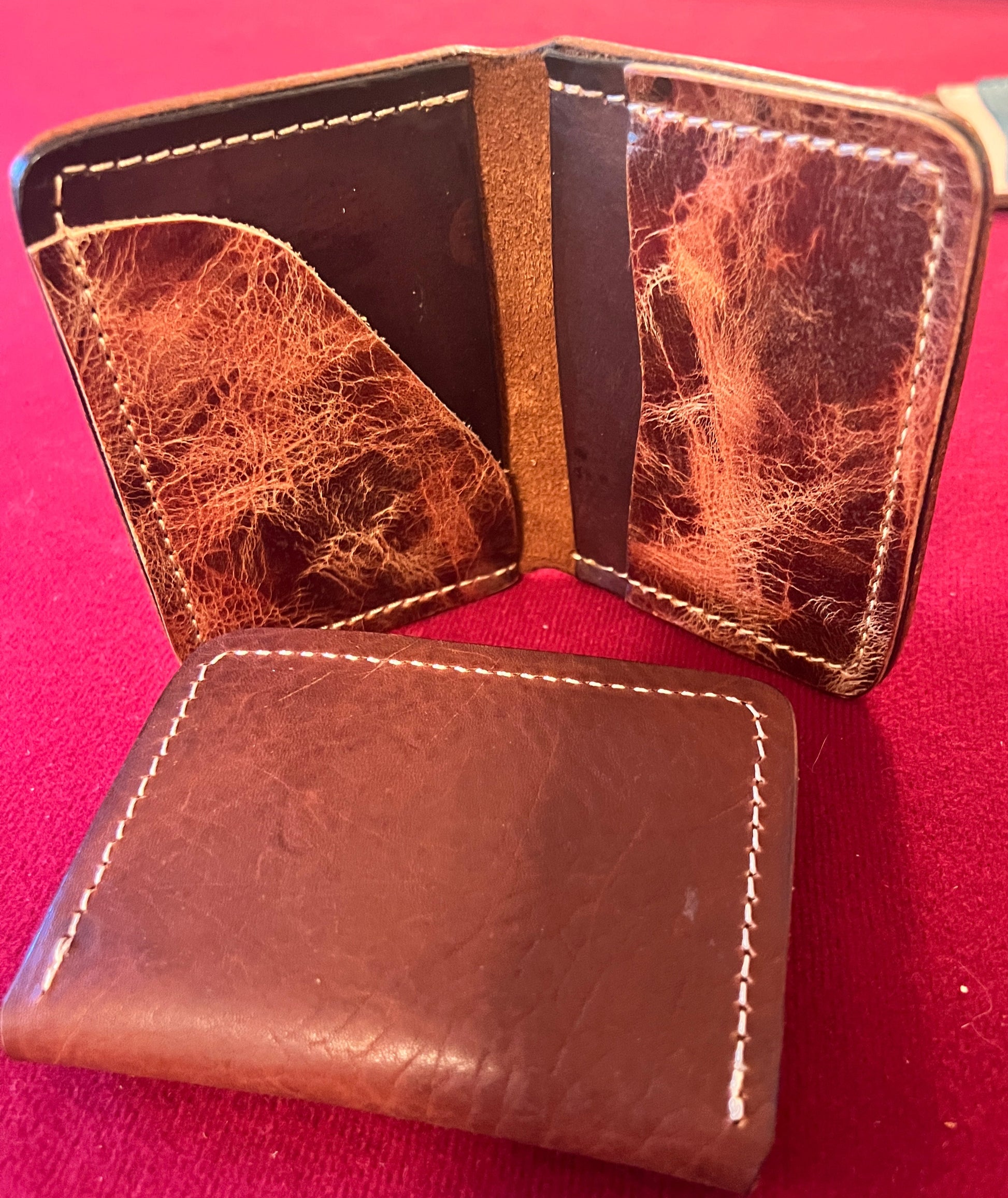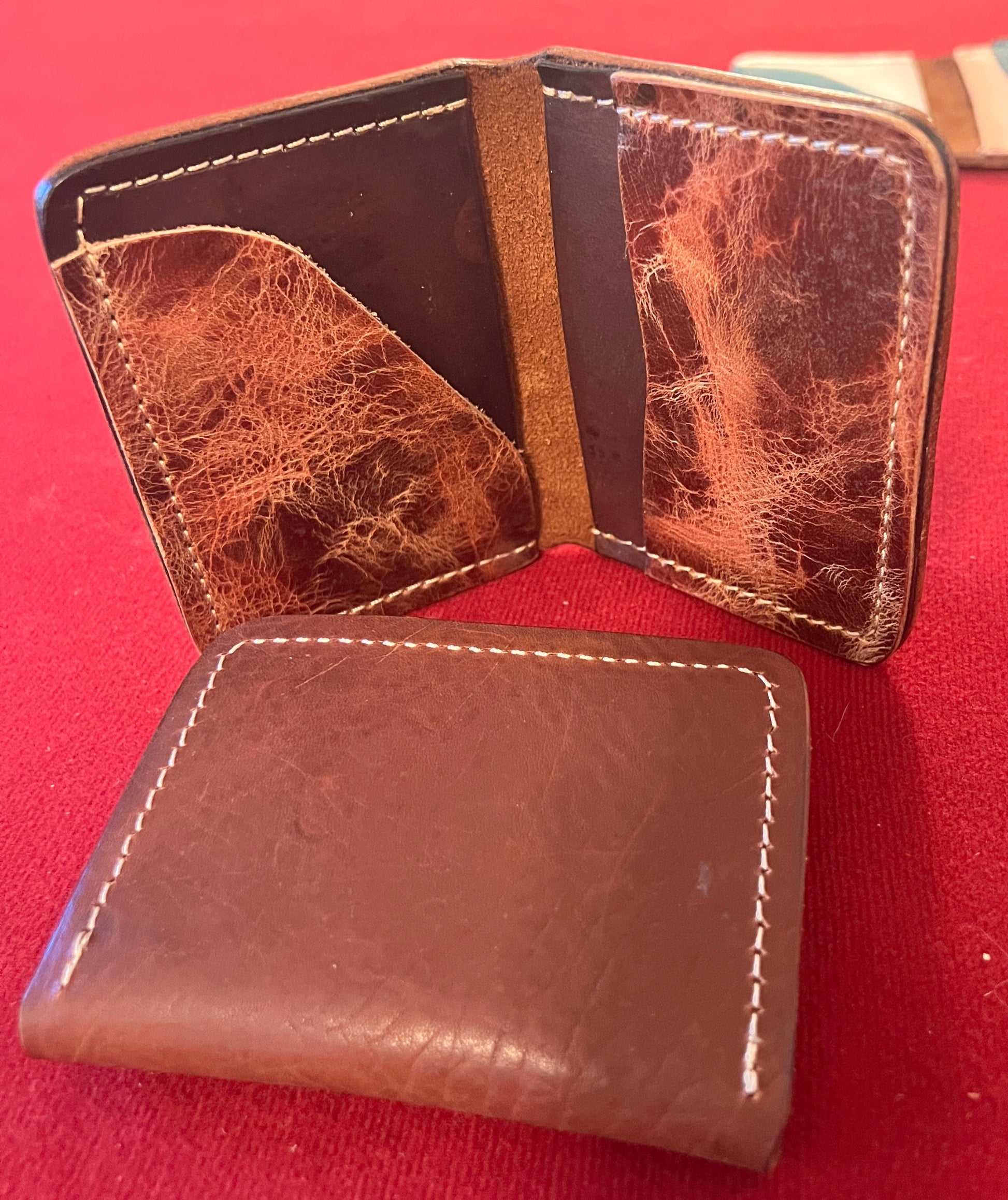 Simple bifold wallet with 4 pockets. Several different leathers used for this simple wallet from chrome tanned to hand-painted Italian leather. Each one different and put together thoughtfully for elegance and style. Edges are hand burnished for a clean look.