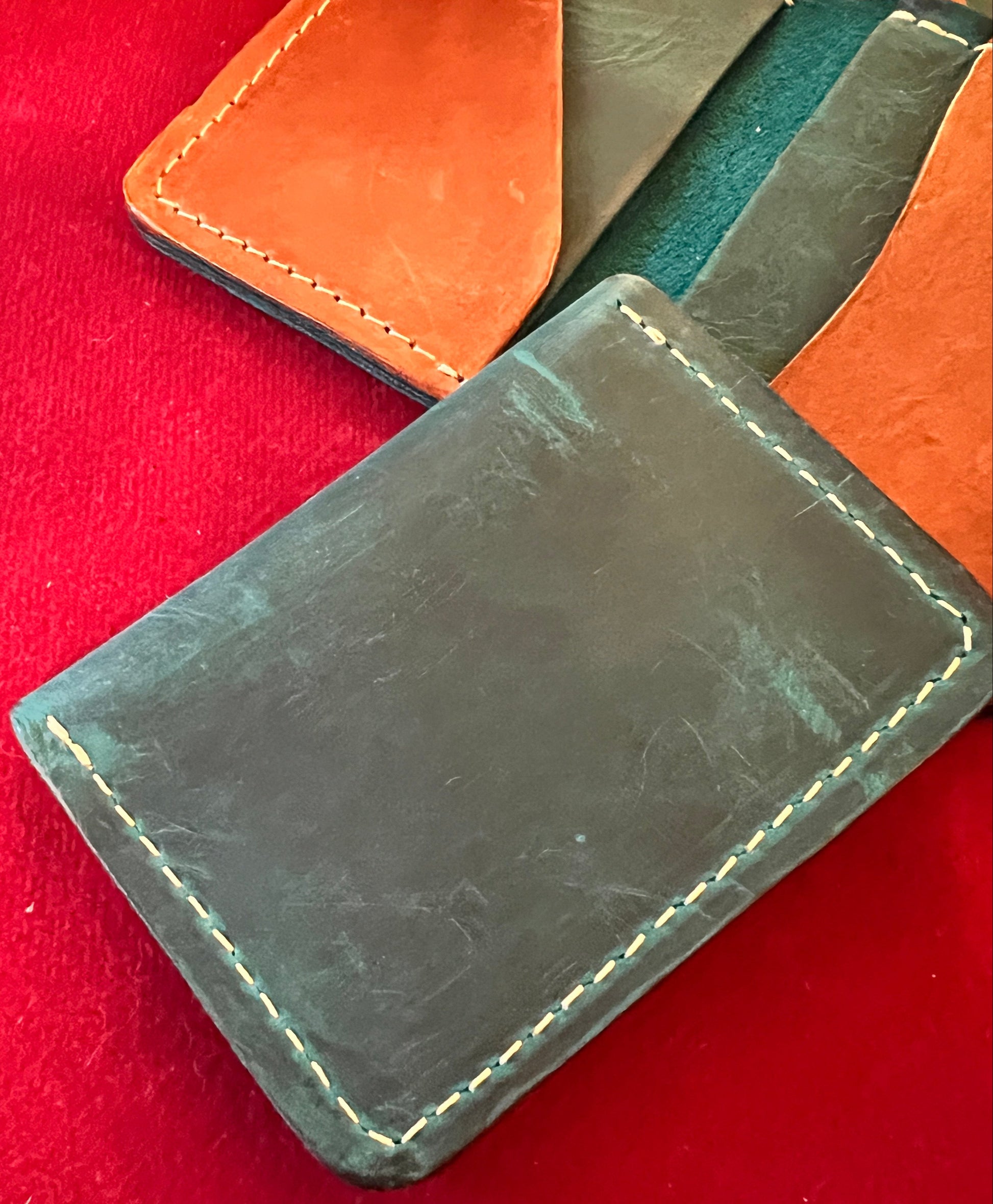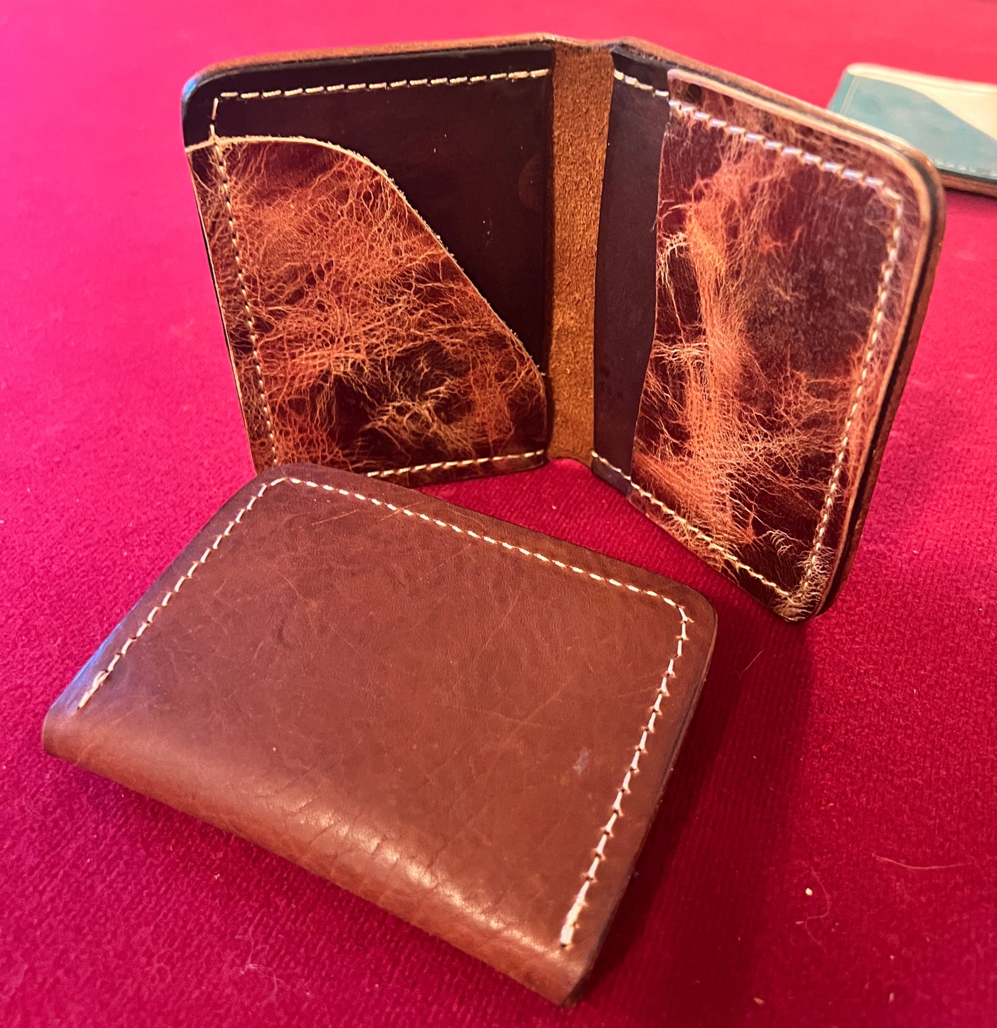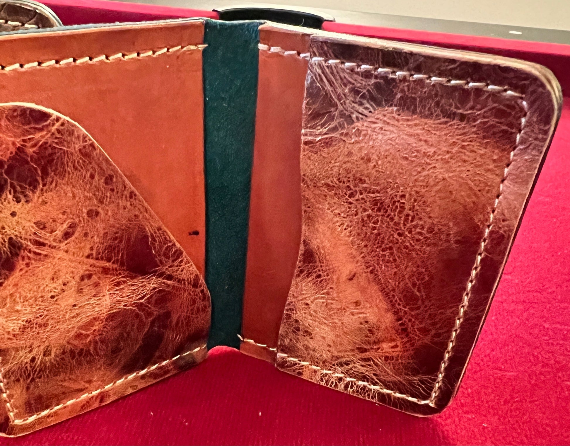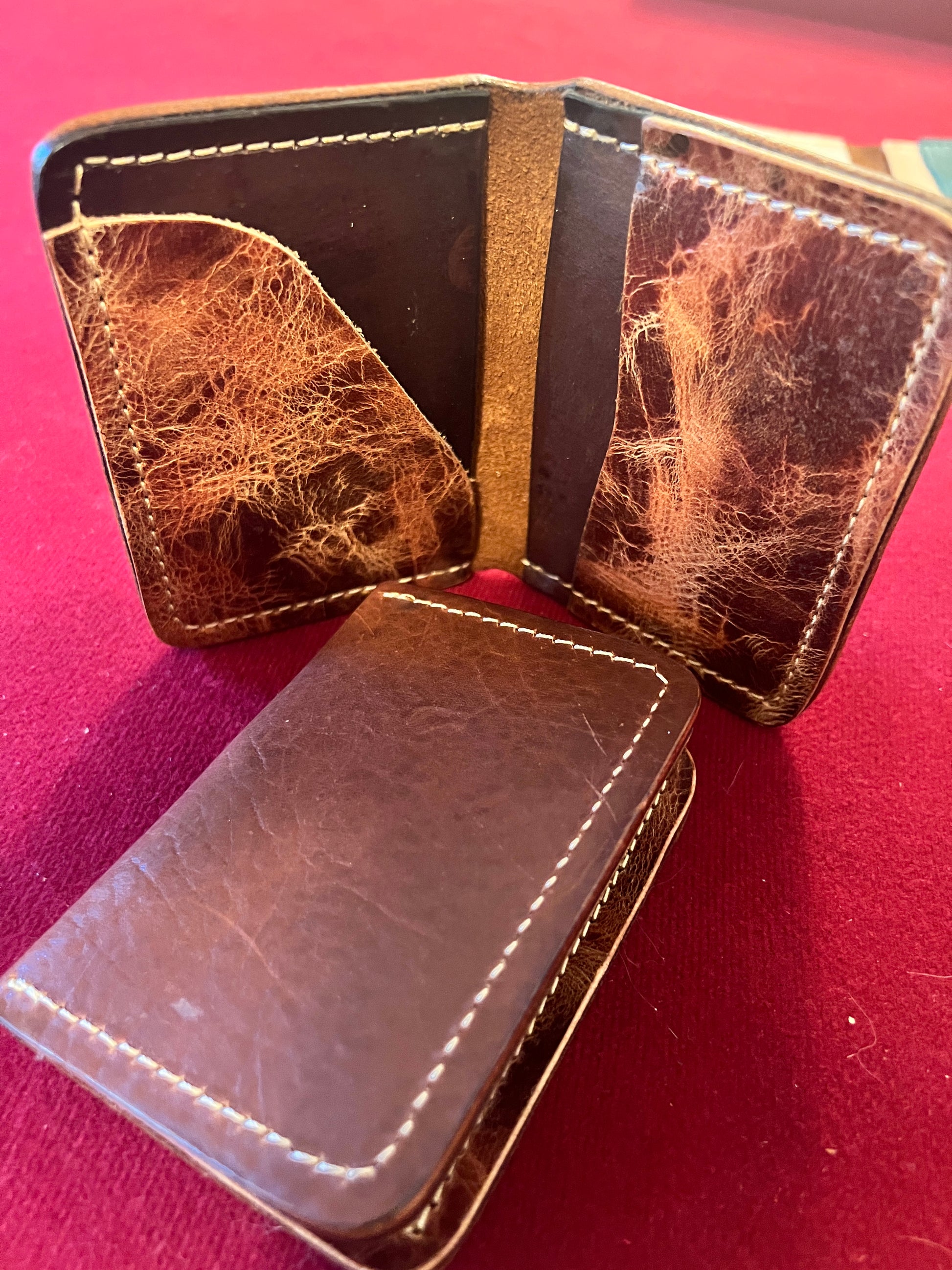 Simple bifold wallet with 4 pockets. Several different leathers used for this simple wallet from chrome tanned to hand-painted Italian leather. Each one different and put together thoughtfully for elegance and style. Edges are hand burnished for a clean look.