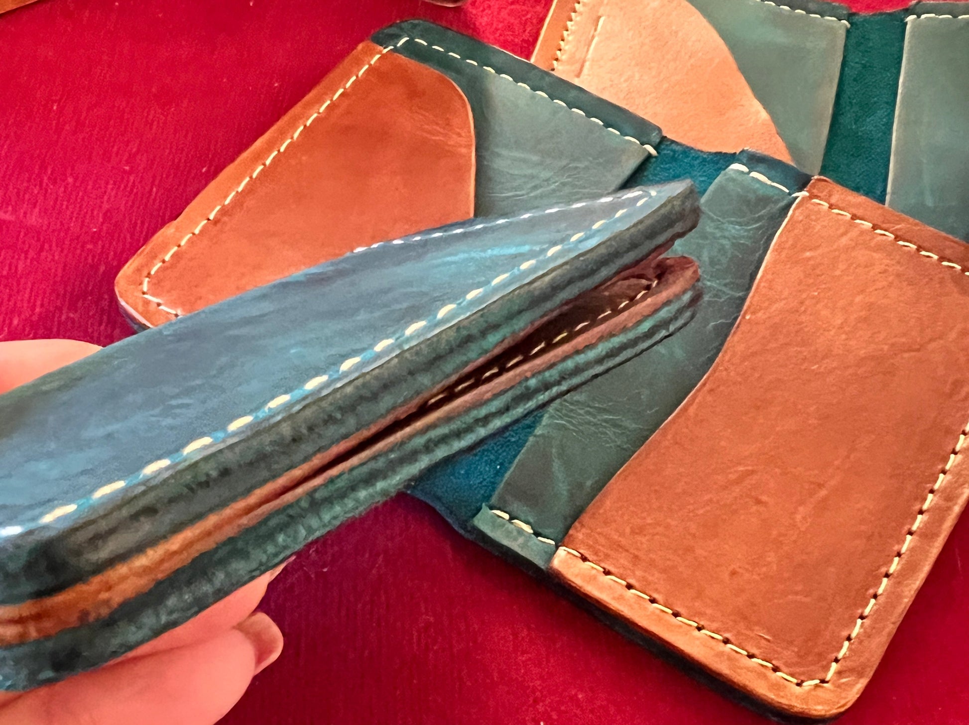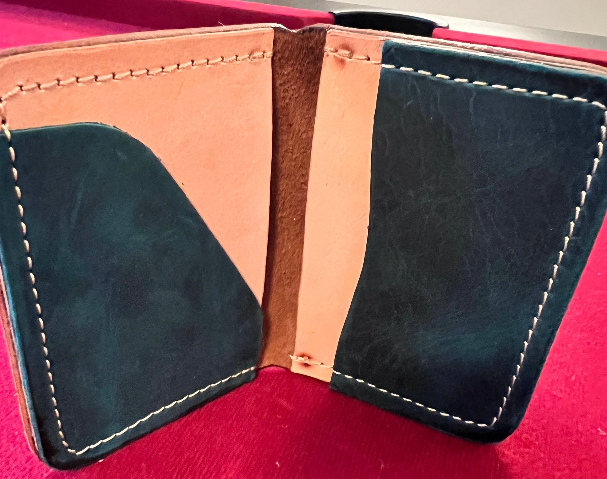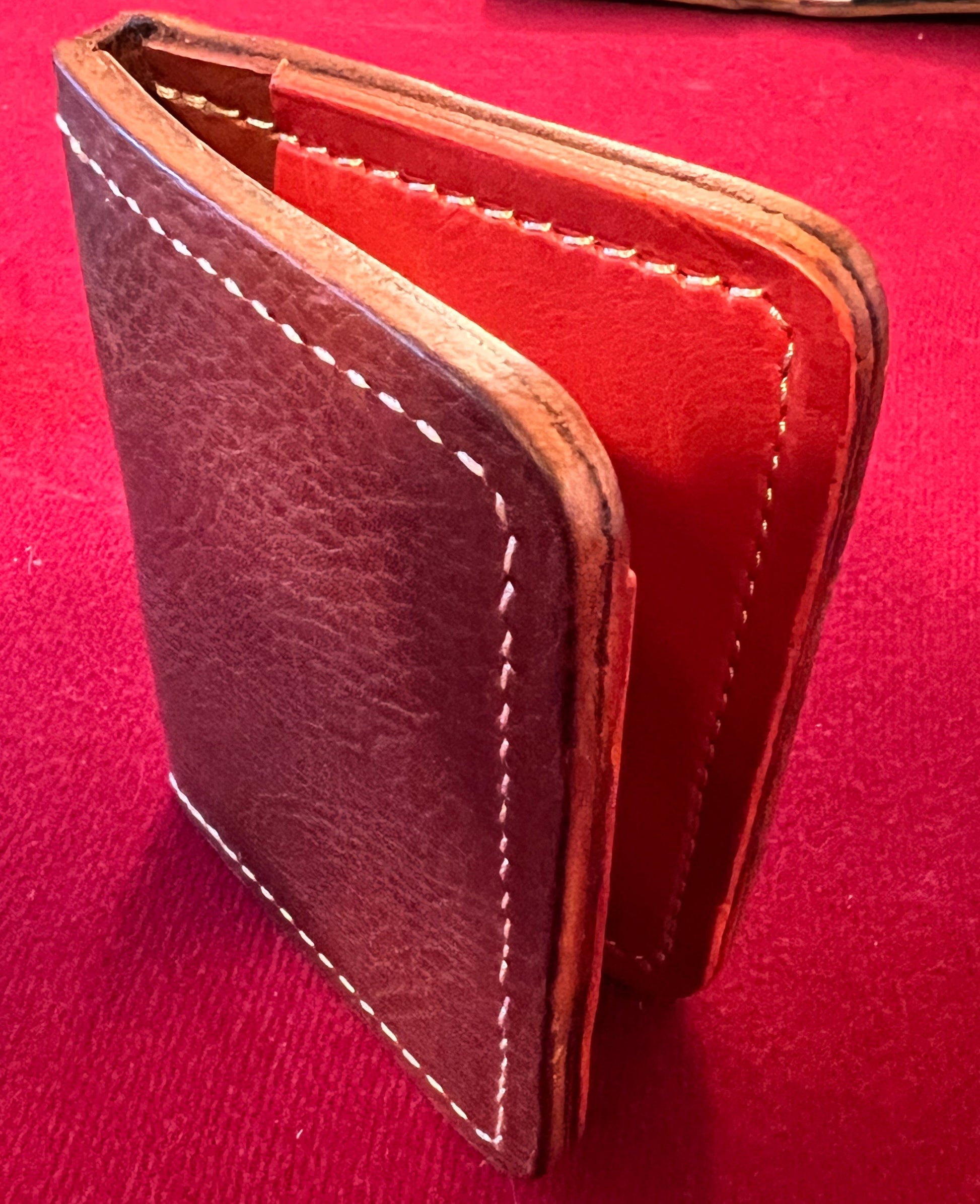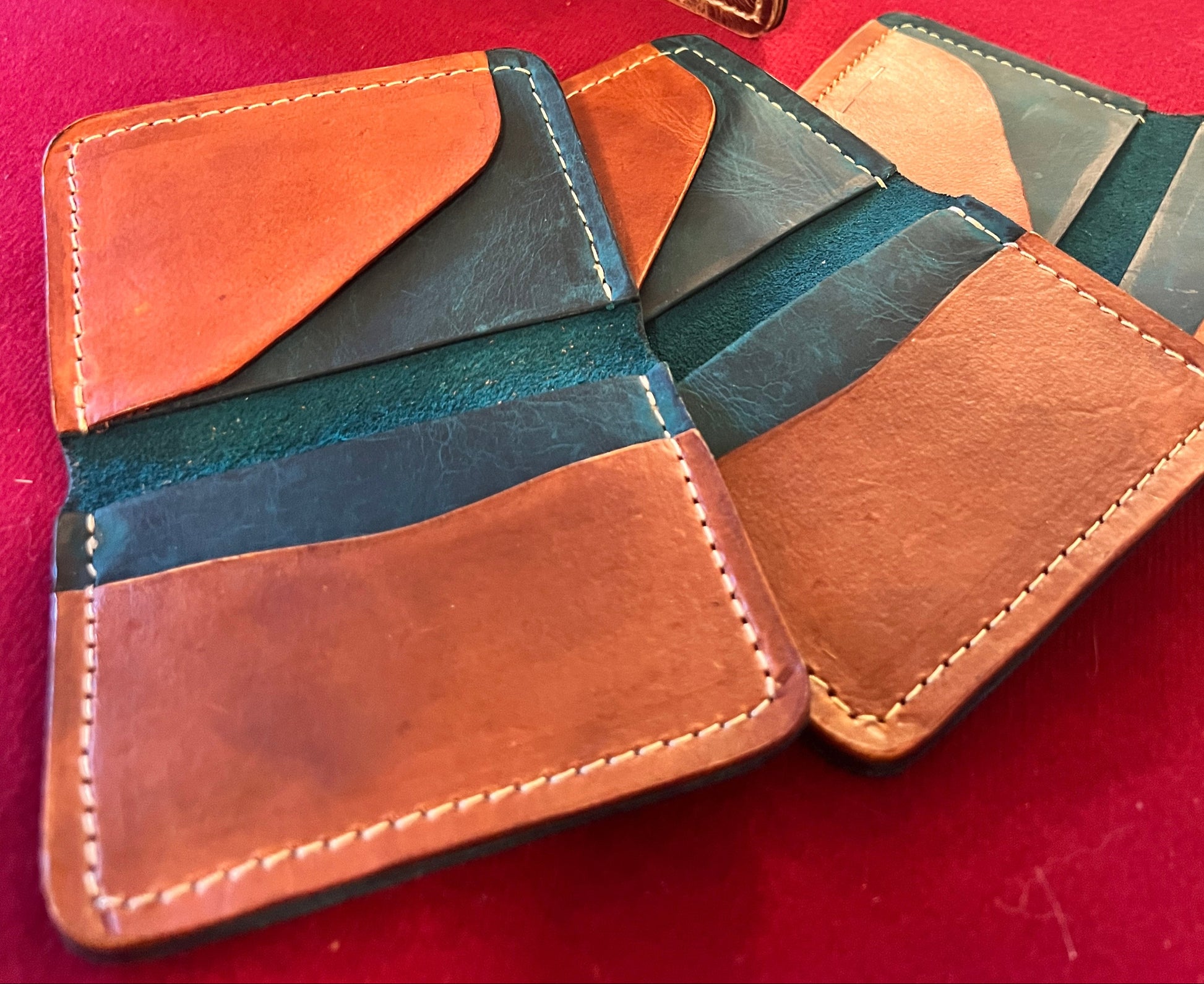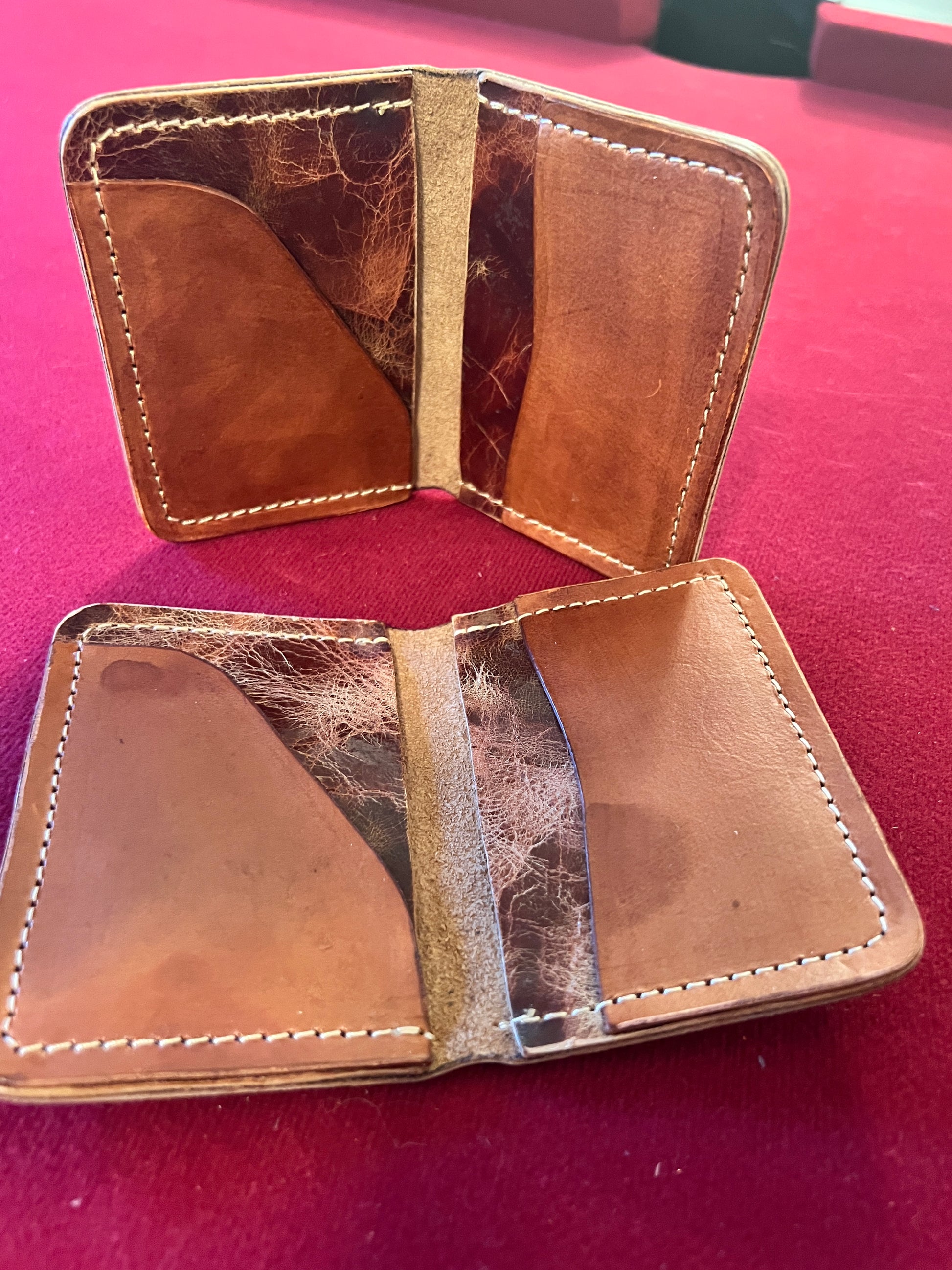 Simple bifold wallet with 4 pockets. Several different leathers used for this simple wallet from chrome tanned to hand-painted Italian leather. Each one different and put together thoughtfully for elegance and style. Edges are hand burnished for a clean look.