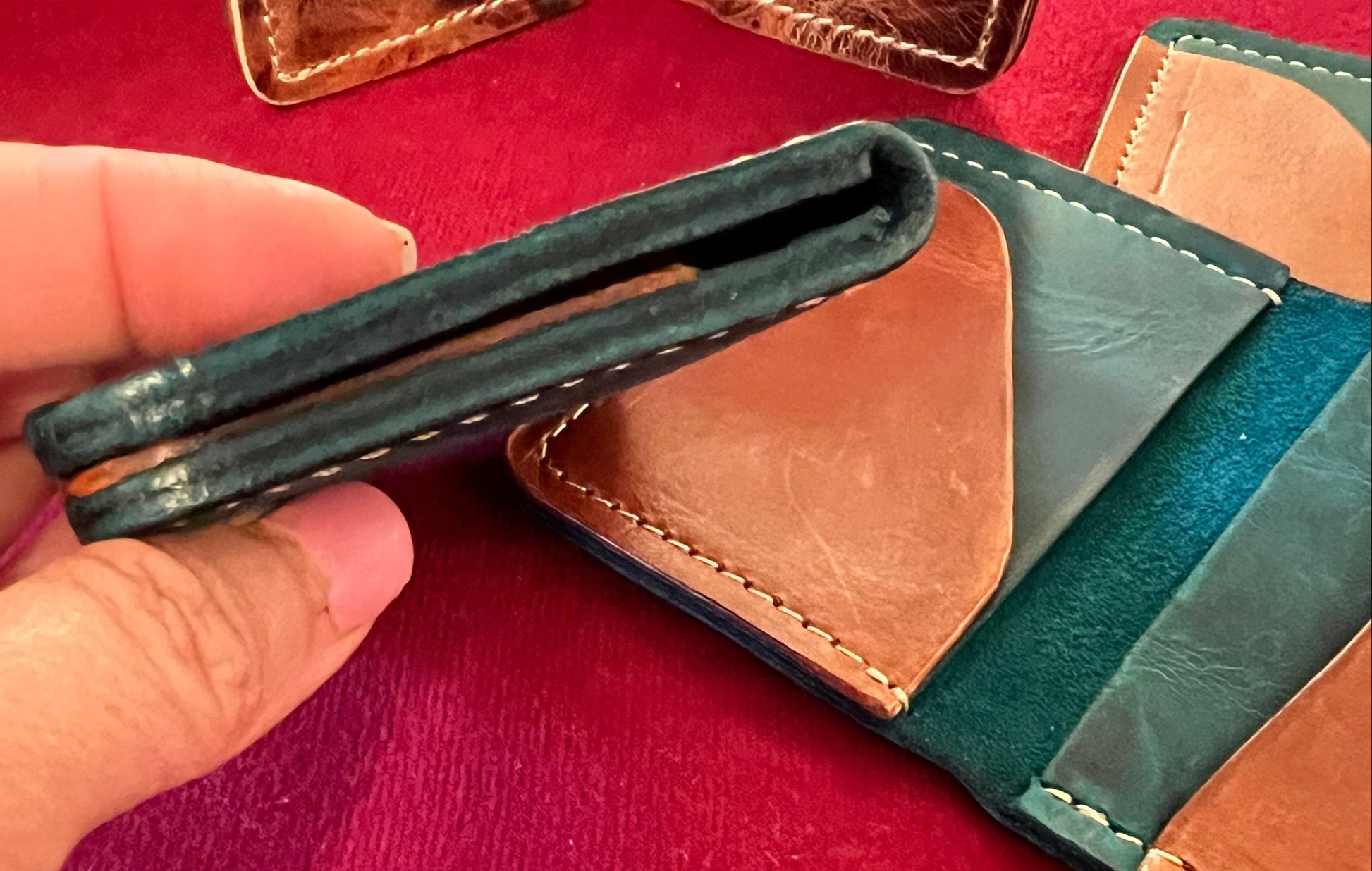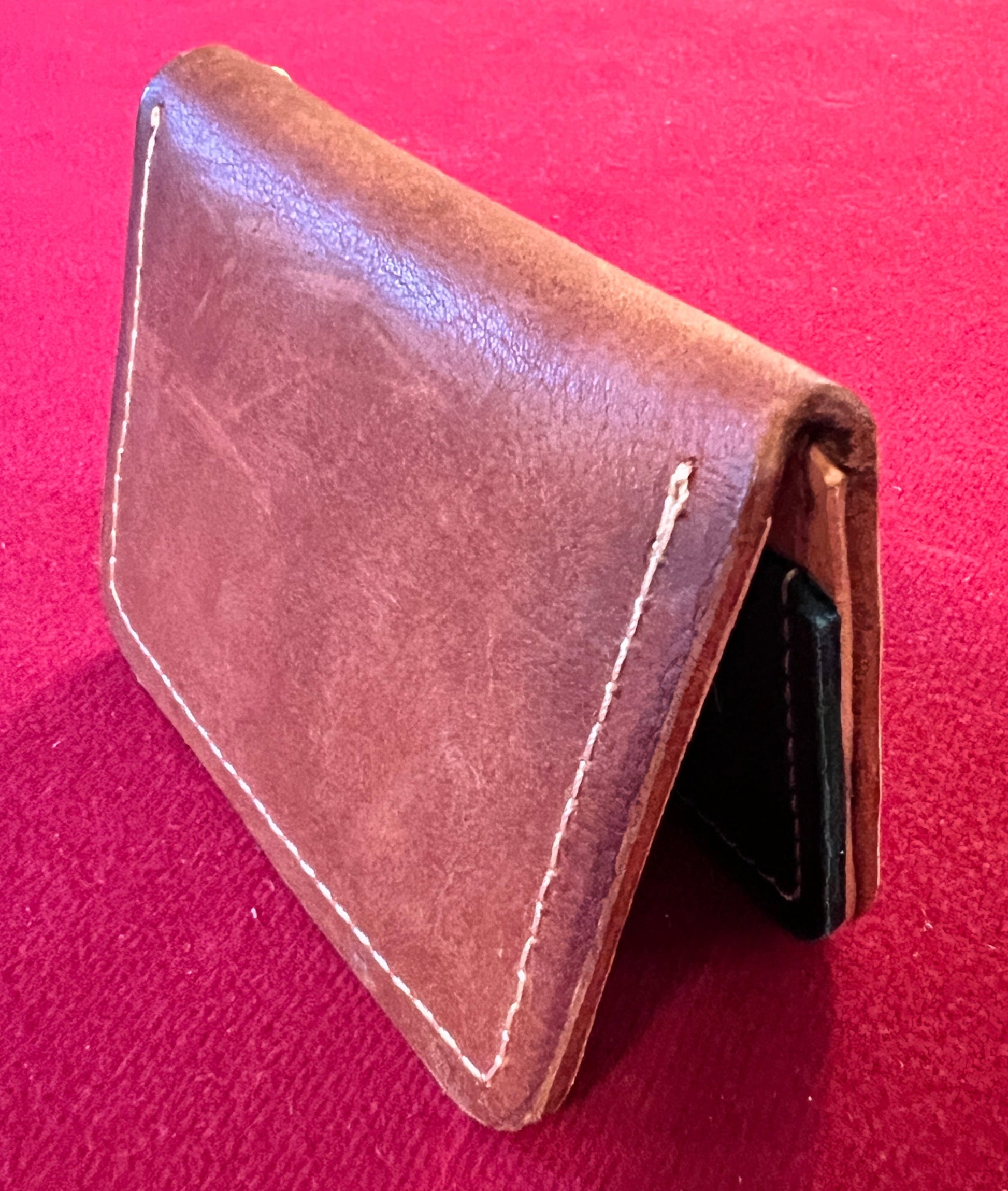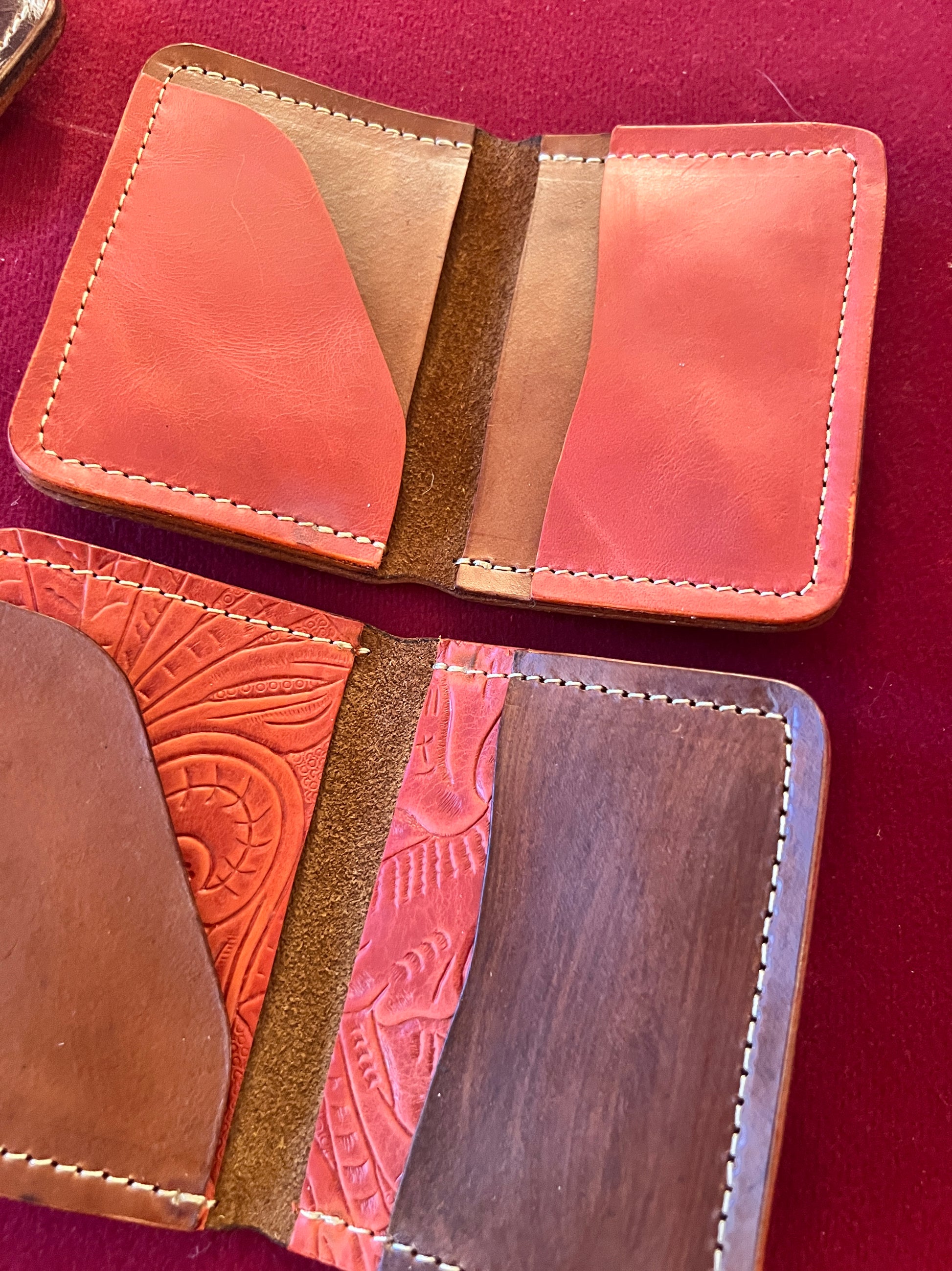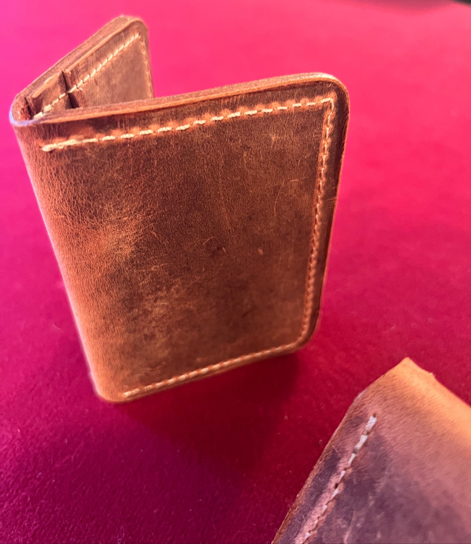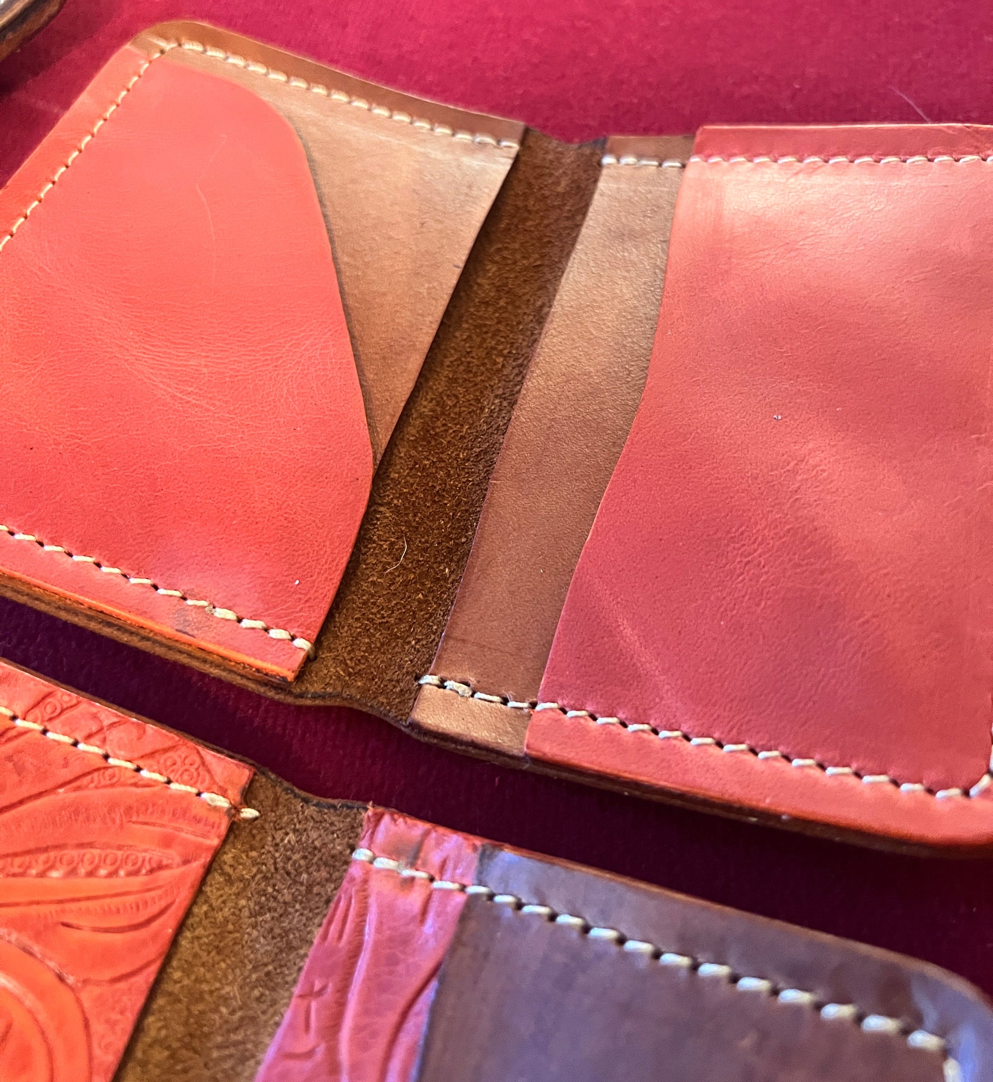 Simple bifold wallet with 4 pockets. Several different leathers used for this simple wallet from chrome tanned to hand-painted Italian leather. Each one different and put together thoughtfully for elegance and style. Edges are hand burnished for a clean look.