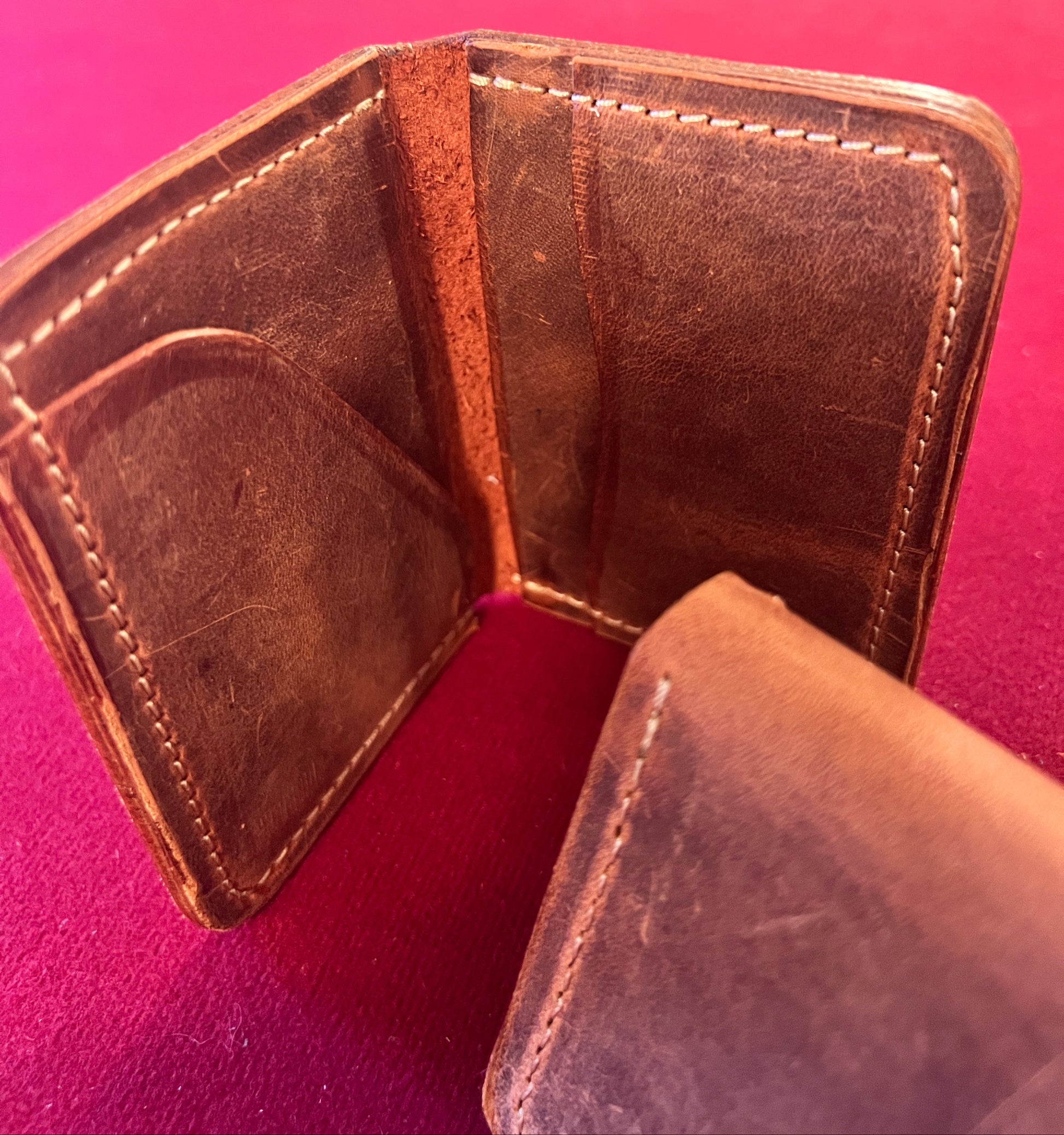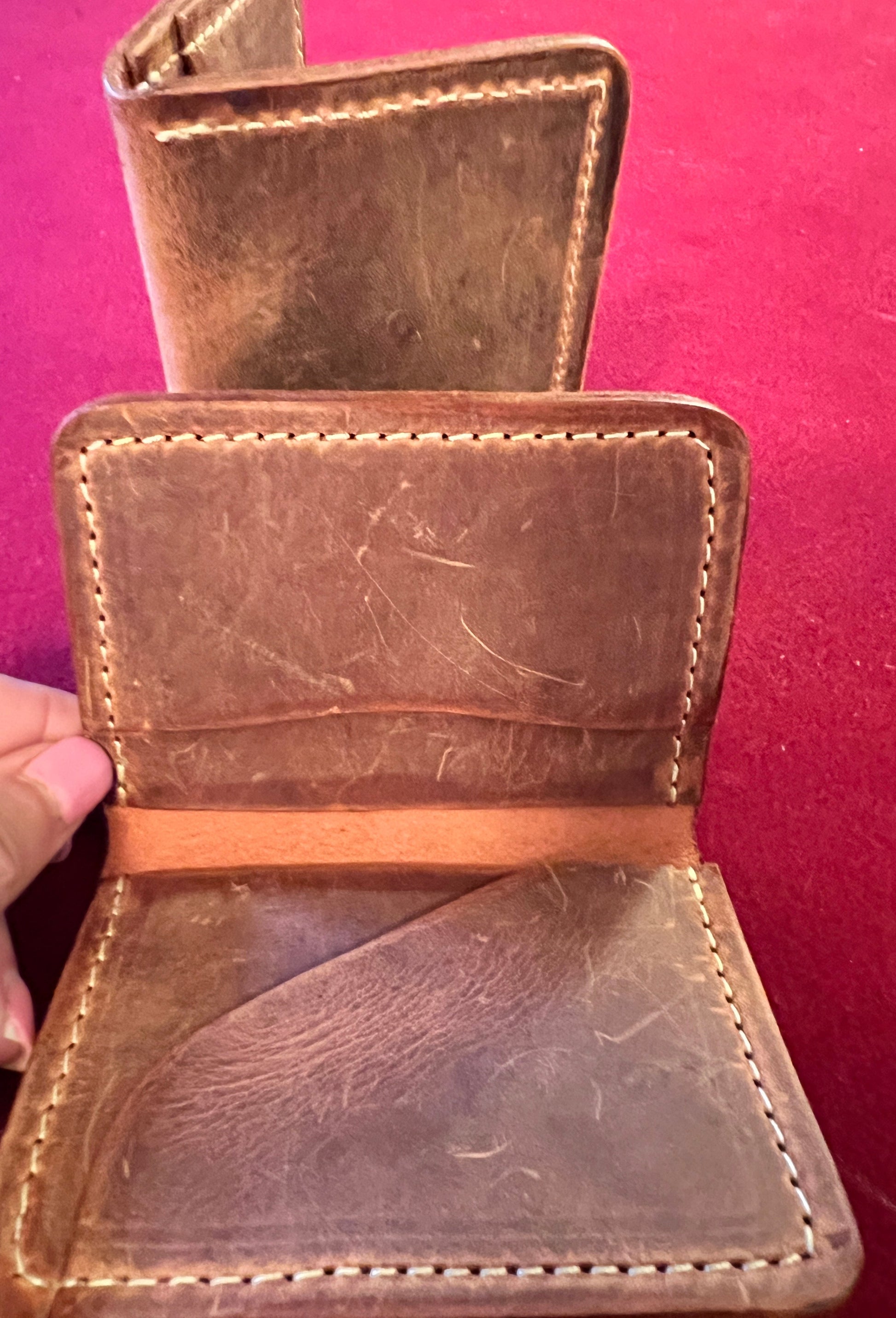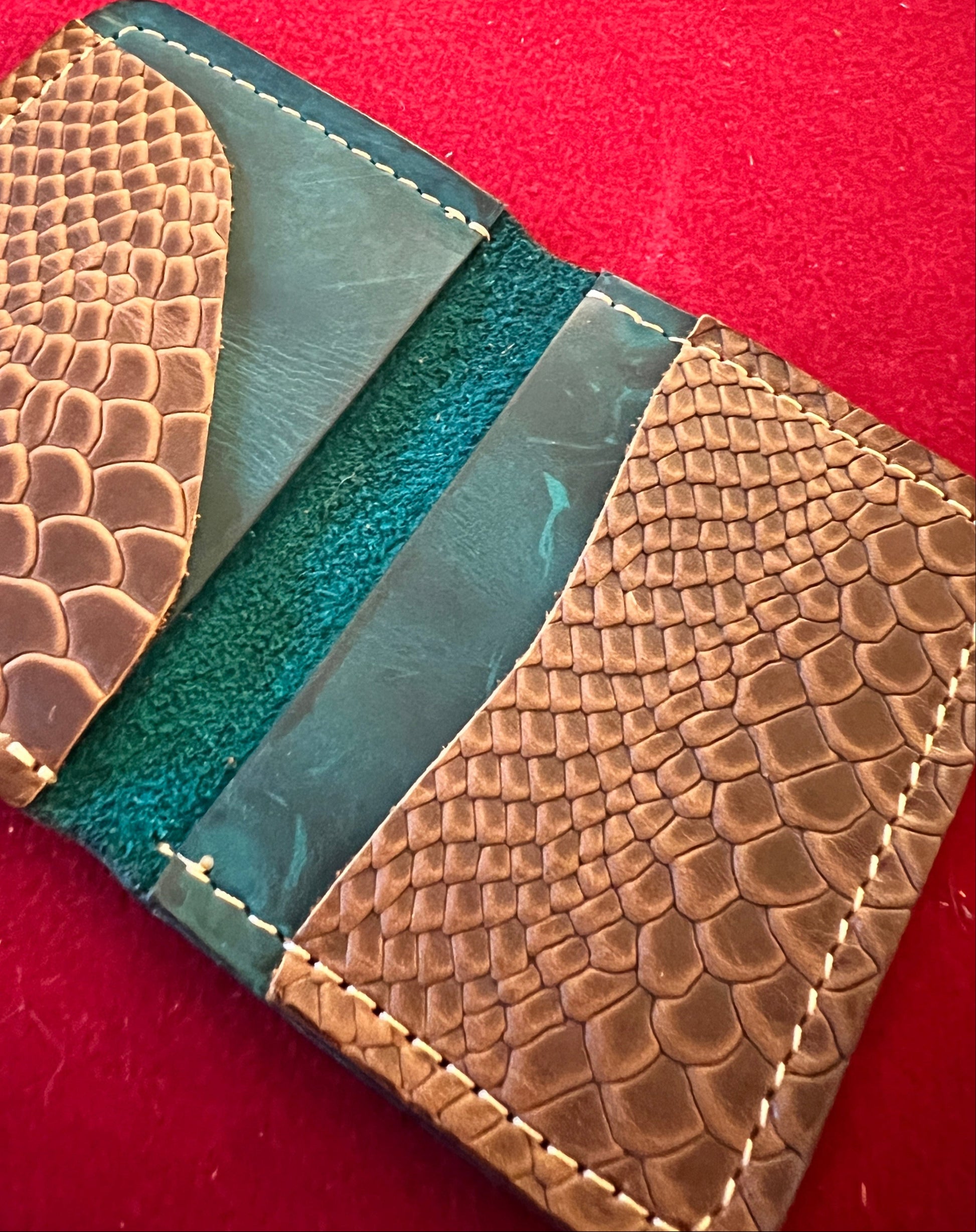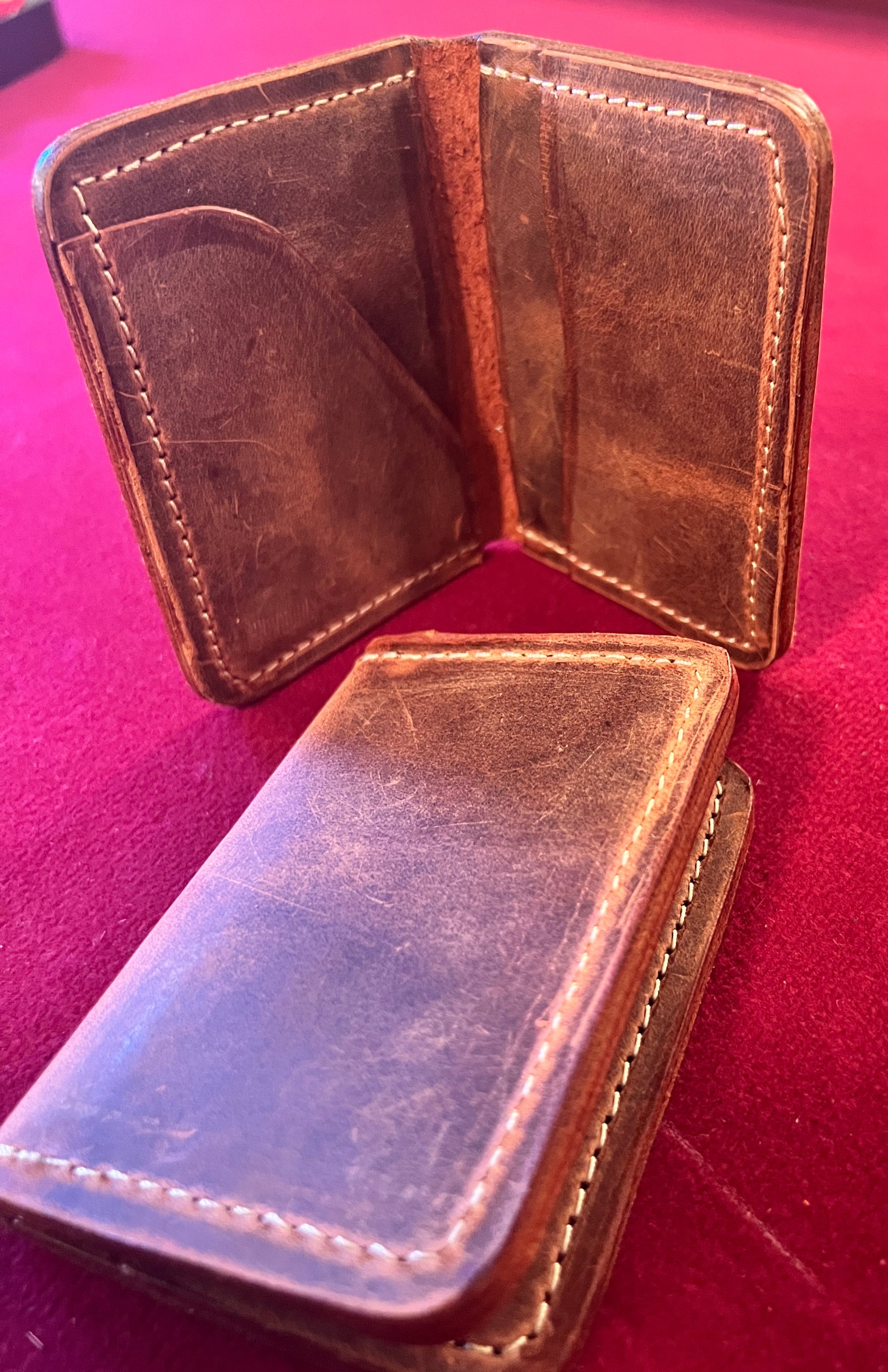 Simple bifold wallet with 4 pockets. Several different leathers used for this simple wallet from chrome tanned to hand-painted Italian leather. Each one different and put together thoughtfully for elegance and style. Edges are hand burnished for a clean look.